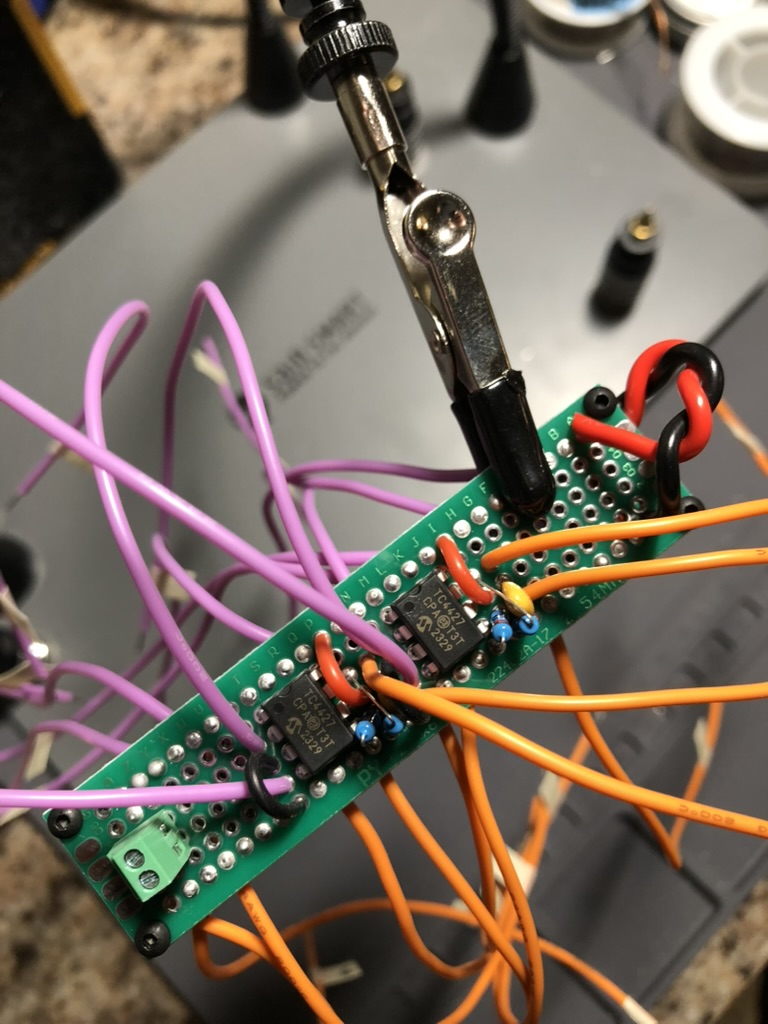 I was running out of ideas. I could not understand why they would be on like that. For whatever reason I decided to grab the stranded wires, with a silicon sheathing, that extended from the output of the gate driver ICs to the input connector on the MOSFET board. I was really surprised when I found that by squeezing the wires together I was able to get MOSFETs to be on that should have been off. (Truthfully, I did not take very good notes during this time period, and I may have been squeezing the inputs for the OR gates coming from the Teensy together.) This was very strange. I did some Googling and found out that what I was observing was called inductive coupling. Suddenly that problem that I had faced with the switch box began to make sense! How to fix it though?
