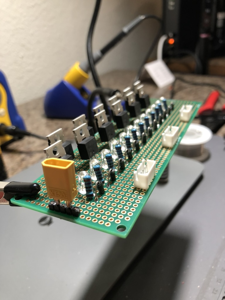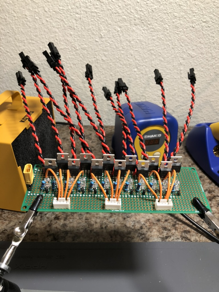 Chief has many similarities to ARALA v2, however, the differences were significant enough to warrant a completely new name – one less confusing than ARALA v2. The OR gates were still there. The inputs for switch box had changed from screw terminals to JST XH (something that you would not think would cause any issues, but surprisingly warrants a different pull-down resistor). These same JST XH connectors are used to connect the output from the MOSFET gate driver ICs to the perfboard that has all the MOSFET circuitry on it.