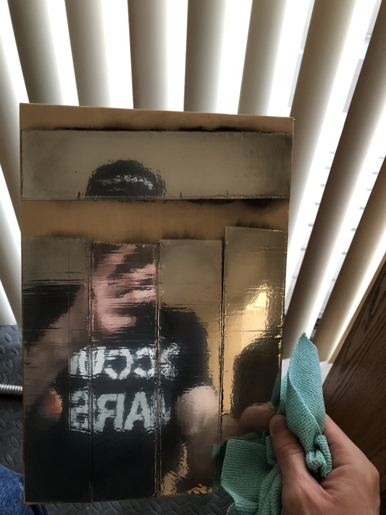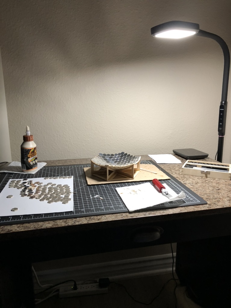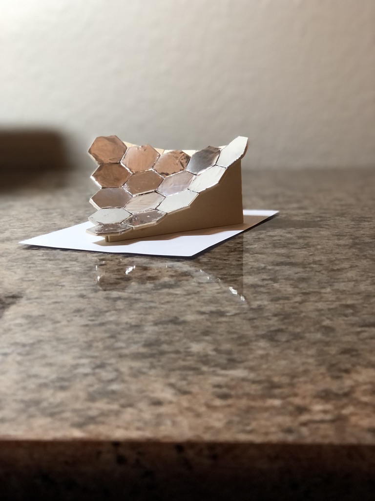 Another consideration that may affect power output is the edges of the aluminum foil on the mirrors. Plenty of adhesive attached itself to the X-acto knife while making the cuts, and I had to clean the knife frequently. This would sometimes pull the foil up and away from the wooden hexagon that it was supposed to be attached to. I did my best to ensure that the edges stayed as close to the wood as possible, and that they remained pushed down, if anything, and not up. I think that this could cause some loss of power if the edges of the mirrors caused the light to reflect in an unintended way.