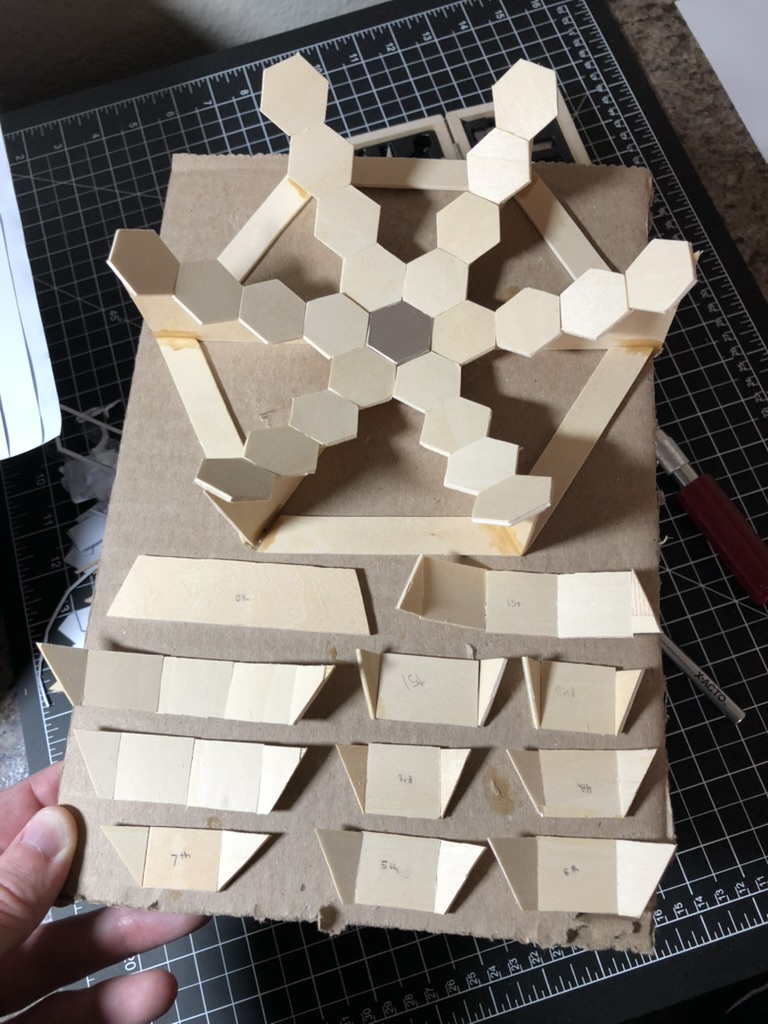 What ended up happening is that some of the mirror pieces did not want to fit in their places on top of the cross sections. When I realized this, I seriously considered scrapping the whole thing and building a new one, but I decided to keep it the way it was. I ended up shaving little slivers from each mirror piece that was giving me trouble. If you were to look at the gif on the homepage long enough, you will see what I am talking about. The size difference in some of the hexagons is very apparent. If I were to repeat the process with a laser cutter, in a well-ventilated area so that I am not inhaling formaldehyde vapors, and wood that was not warped, then things would fit together much better.